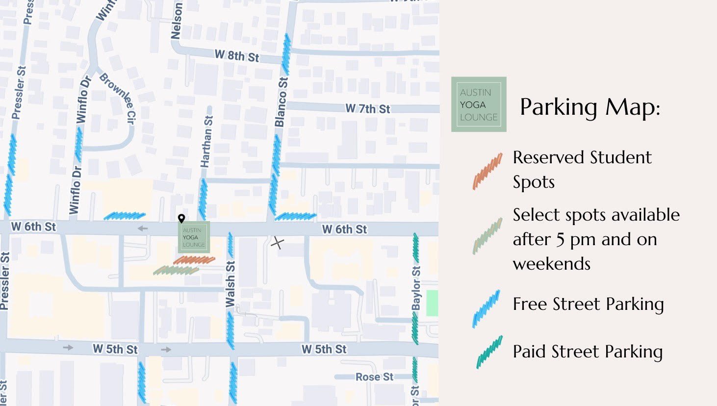 Reserved student spots in the parking lot labeled "STUDENT PARKING ONLY" and "ATX YOGA" (first-come, first-served)
